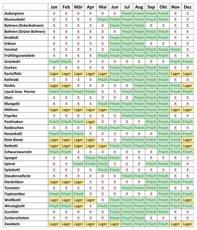 Nachfolgend bieten wir euch einen Saisonkalender für einheimische Gemüsesorten zum Download an. Dort erfahrt ihr, welche Sorten aktuell frisch erhältlich sind bzw. als Lagerware aus heimischen Anbau angeboten werden. Ein rotes X bedeutet, dass diese Sorte im jeweiligen Monat nicht verfügbar ist. Hier macht es Sinn, den Speiseplan auf frische Ware umzustellen. Alternativen gibt es immer. Dies wussten auch unsere Vorfahren, die gar keine Wahl hatten, als saisonal zu kochen. Nach der Spargelzeit freute man sich auf Rosenkohl und in den Wintermonaten auf Grünkohl mit Knackwurst. In dieser Weise zu essen, sollte man sich auch heutzutage angewöhnen, anstatt sich auf holländische Tomaten zu stürzen und gleichzeitig über die CO2-Bilanz eines Diesel-Fahrzeuges zu wettern.